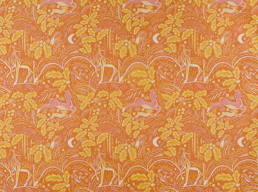 ‘Staffordshire’ depicts an abstract wild woodland scene, in which the deer can leap freely around oak leaves and ferns. By playing with scale and placement, Beki creates a dreamlike quality inviting the viewer to immerse themselves in a delightful world of texture, colour and pattern.