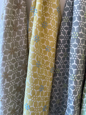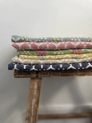 Kali is a beautiful geometric design, inspired by traditional block print patterns. Hand block printed and embroidered on linen by talented artisans in India.