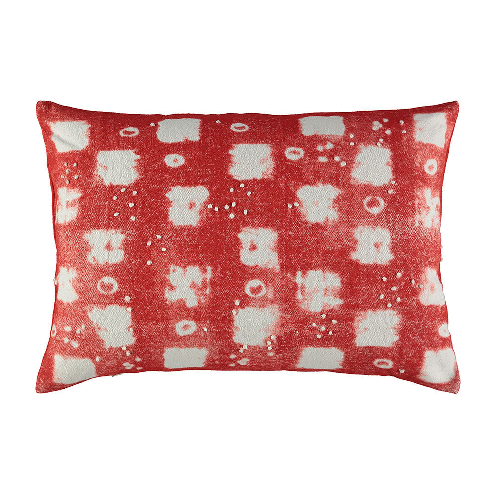 Washed colours with the feel of a block printed design create this soft geometric pattern. Printed on pure cotton and embellished with embroidered french knot detailing. Plain reverse in a coordinating shade of red.